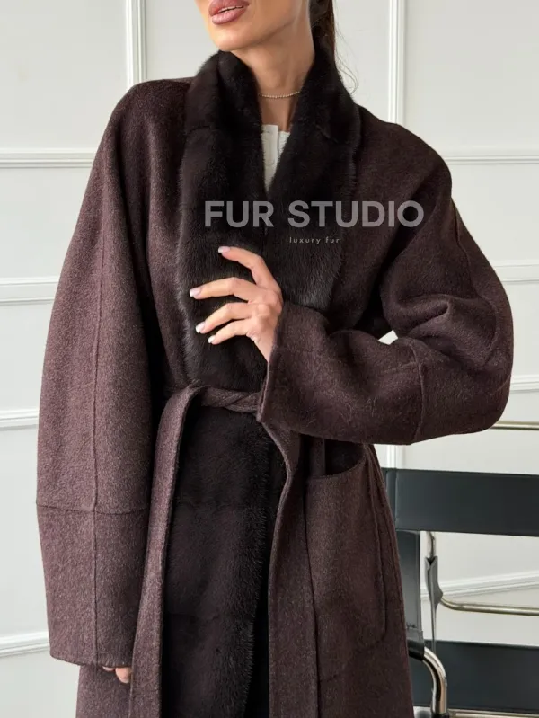 Длинное демисезонное пальто с мехом норки 102673