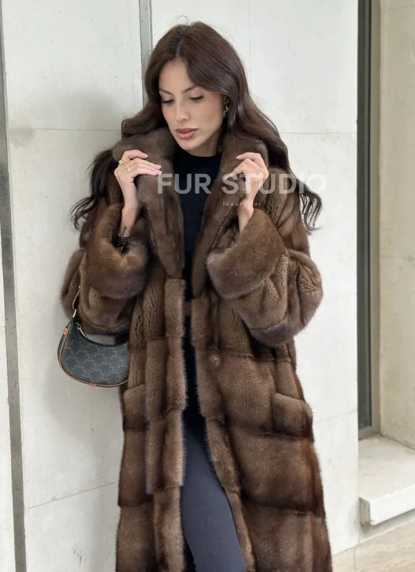 Мех данной шубы аукционная норка, цвет коричневый. Предлагается в размерах от 42 до 66. Длина модели 115-120 см, что выгодно подчеркивает фигуру девушек. Эта модель идеально подойдет для девушек и женщин, предпочитающих роскошные натуральные меха.