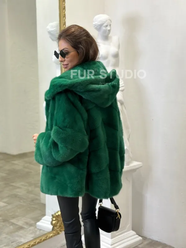 Норковый полушубок с капюшоном - цвет изумруд 100608