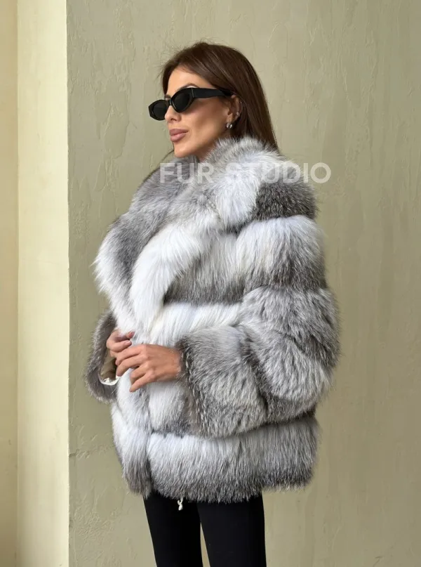 Шуба из меха арктической лисы - отличный выбор женщин, которые любят выглядеть стильно в зимнее время года. Мех смотрится шикарно и богато. Необычная расцветка подчеркнет цвет волос и глаз владелицы. В шубе будет комфортно в холодную зиму. Широкие манжеты делают акцент на тонкости кистей.