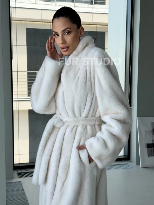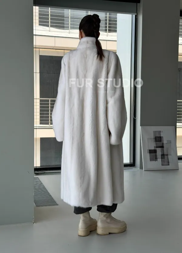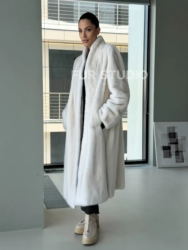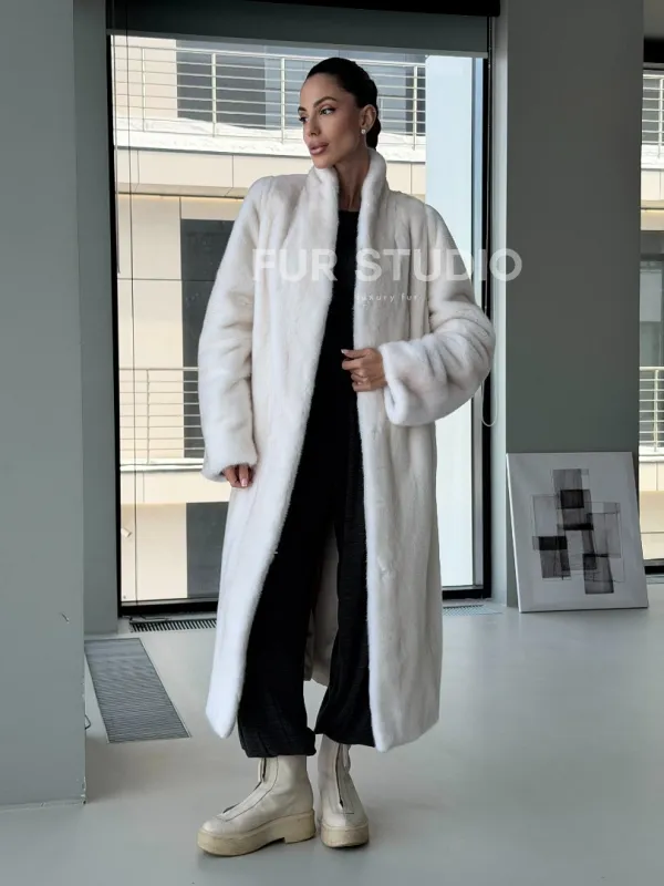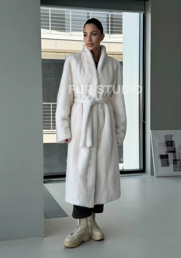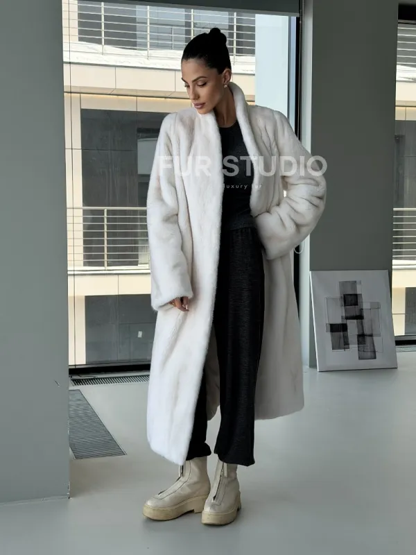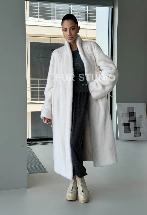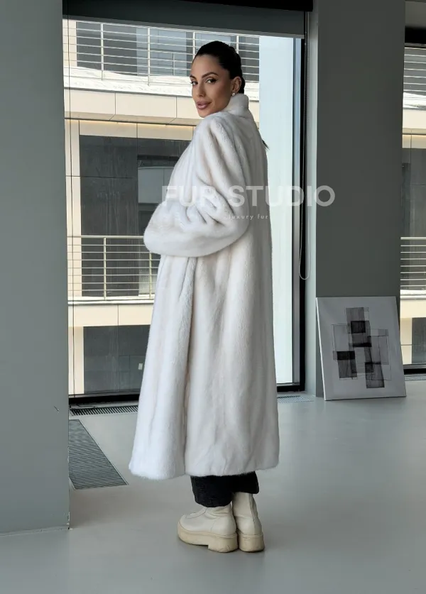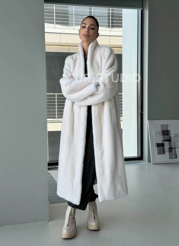 Мех данной шубы аукционная норка, цвет белый. Предлагается в размерах от 42 до 50. Длина модели 115-120 см, что выгодно подчеркивает фигуру девушек. Эта модель идеально подойдет для девушек и женщин, предпочитающих роскошные натуральные меха.