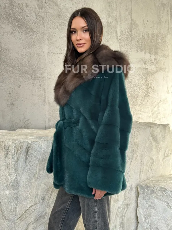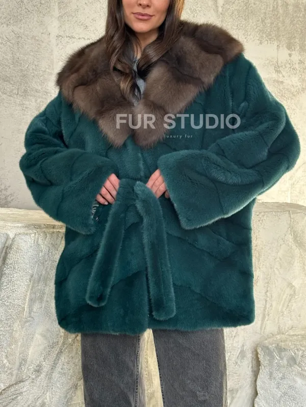 Мех данной шубы аукционная норка, цвет зеленый. Предлагается в размерах от 42 до 50. Длина модели 75-80 см, что выгодно подчеркивает фигуру девушек. Эта модель идеально подойдет для девушек и женщин, предпочитающих роскошные натуральные меха.