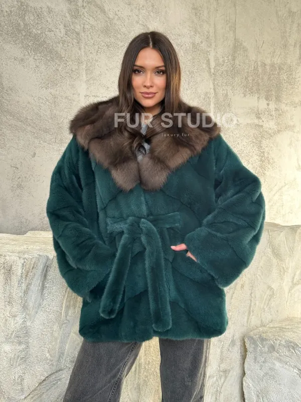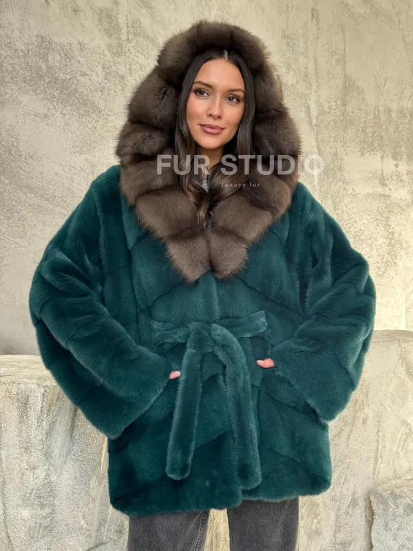 Шуба норка кимоно - капюшон куница 102513