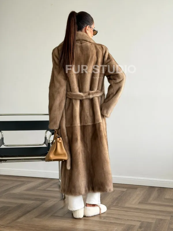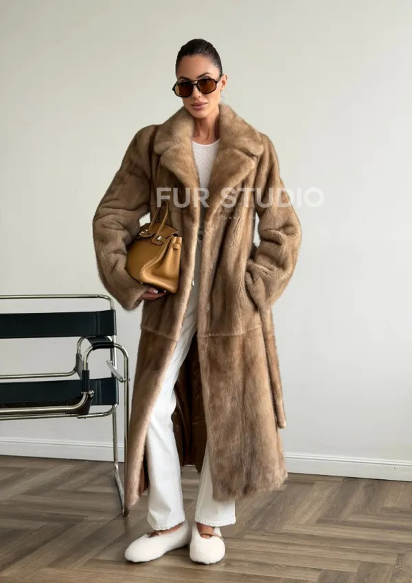 Мех данной шубы аукционная норка , цвет бежевый. Предлагается в размерах от 42 до 50. Длина модели 115-120 см, что выгодно подчеркивает фигуру девушек. Эта модель идеально подойдет для девушек и женщин, предпочитающих роскошные натуральные меха.