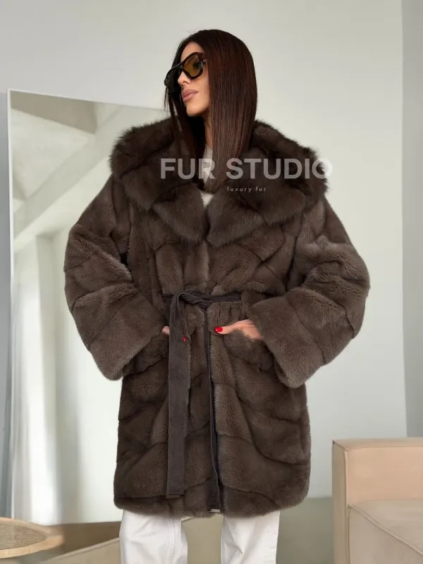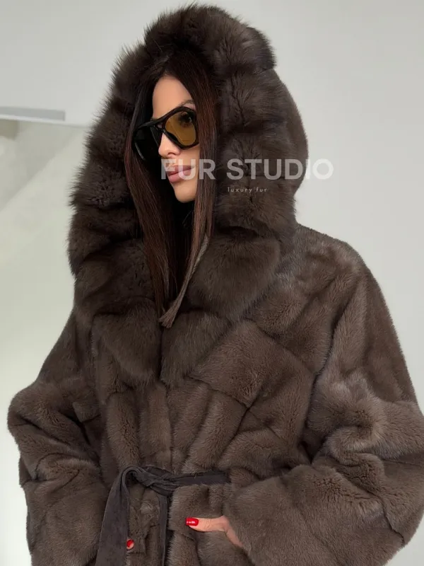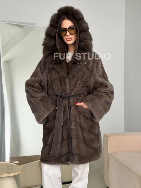 Шуба норковая с капюшоном из куницы 102786