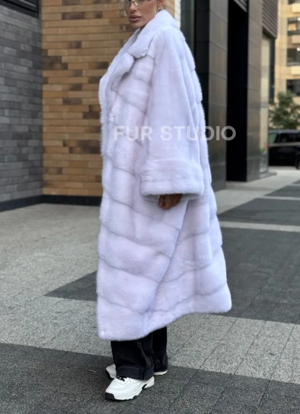 Мех данной шубы аукционная норка , цвет белый. Предлагается в размерах от 42 до 68. Длина модели 115-120 см, что выгодно подчеркивает фигуру девушек. Эта модель идеально подойдет для девушек и женщин, предпочитающих роскошные натуральные меха.