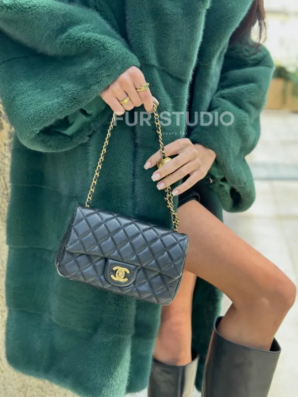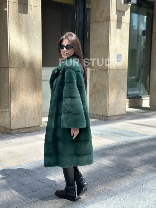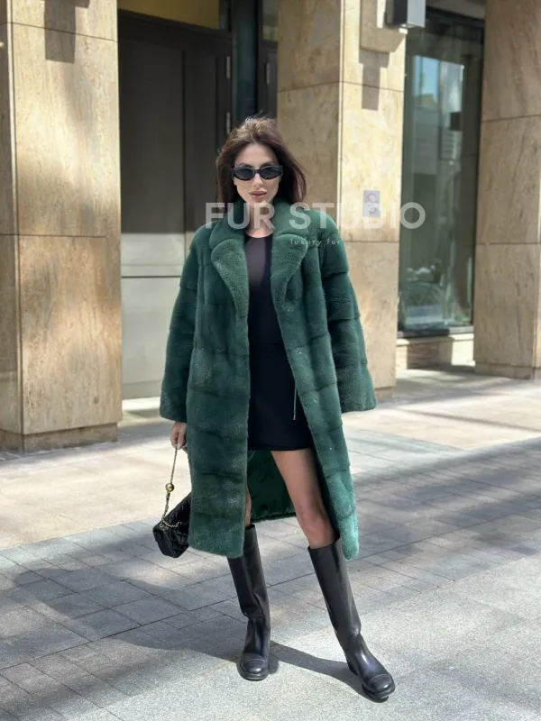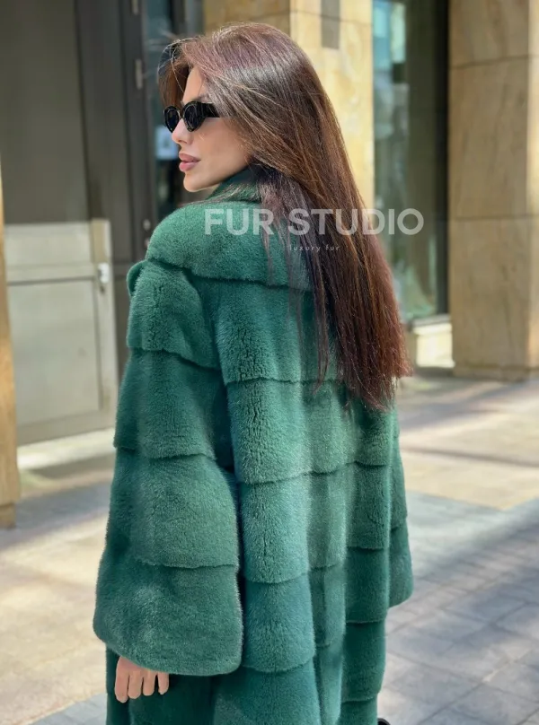 Мех данной шубы аукционная норка , цвет зеленый. Предлагается в размерах от 42 до 52. Длина модели 95-100 см, что выгодно подчеркивает фигуру девушек. Эта модель идеально подойдет для девушек и женщин, предпочитающих роскошные натуральные меха.