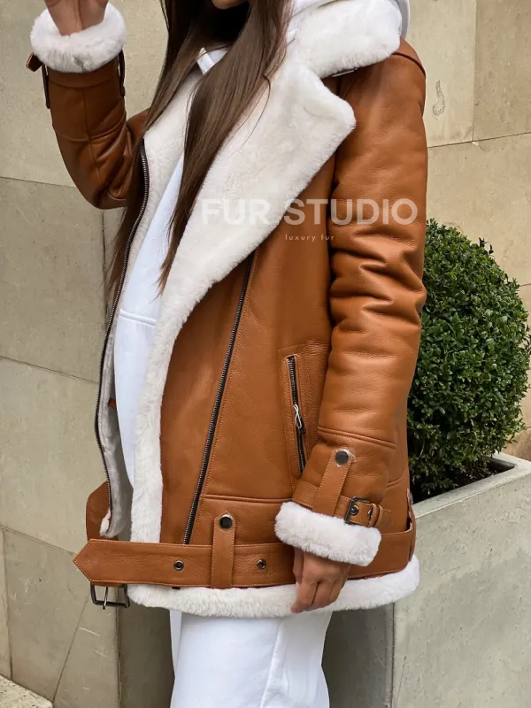 Женская дубленка авиатор в цвете виски – выбор современных девушек. Модель авиатор хит этого года. В дубленке будете выглядеть стильно и ярко вне зависимости от времени года. Яркая расцветка отлично гармонирует с любым цветом волос. Теплая подкладка позаботится о том, чтобы владелица не замерзла в сильные холода. Шикарный воротник подчеркнет изгибы шеи и согреет ее от непогоды.
